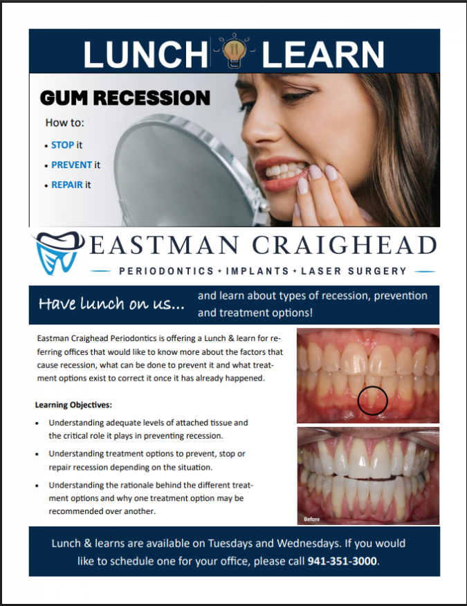 SARASOTA, Fla. - EntSun -- Eastman Craighead Periodontics, a respected leader in periodontal and implant dentistry, has announced two major education programs for 2025: the Eastman Craighead Dental Hygiene Study Club and a Lunch & Learn Series focused on the prevention and treatment of gum recession.