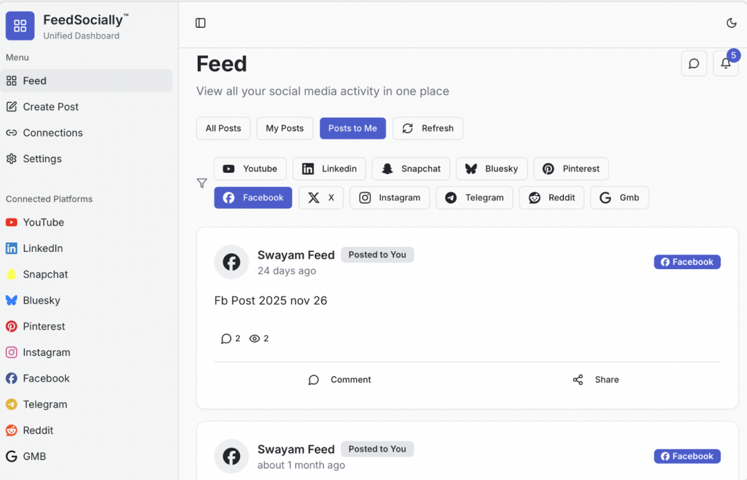 Notifications: Stay informed with alerts for new activity on your posts across all connected platforms.