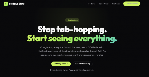 With the tagline "All Your Marketing Data, One Dashboard" and the promise to "Stop tab-hopping. Start seeing everything," Foxtown Stats automatically pulls real-time metrics from leading platforms including Google Ads, Google Analytics, Google Search Console, Google Business Profile, Google Local Services Ads, Meta Ads, SEMRush, Yelp, and HubSpot presenting spend, conversions, traffic, ROI, search rankings, reviews, leads, and more in a single, clean interface.