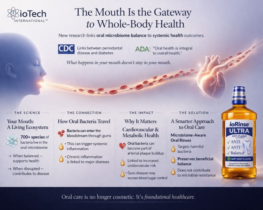 Herb Moskowitz, DDS, Chairman of ioTech International, noted, "Scientific consensus increasingly points to inflammation and microbial imbalance as the key mechanisms linking oral health to systemic disease. Oral bacteria and inflammatory mediators can enter the bloodstream, contributing to systemic inflammation and potentially impacting distant organs."
