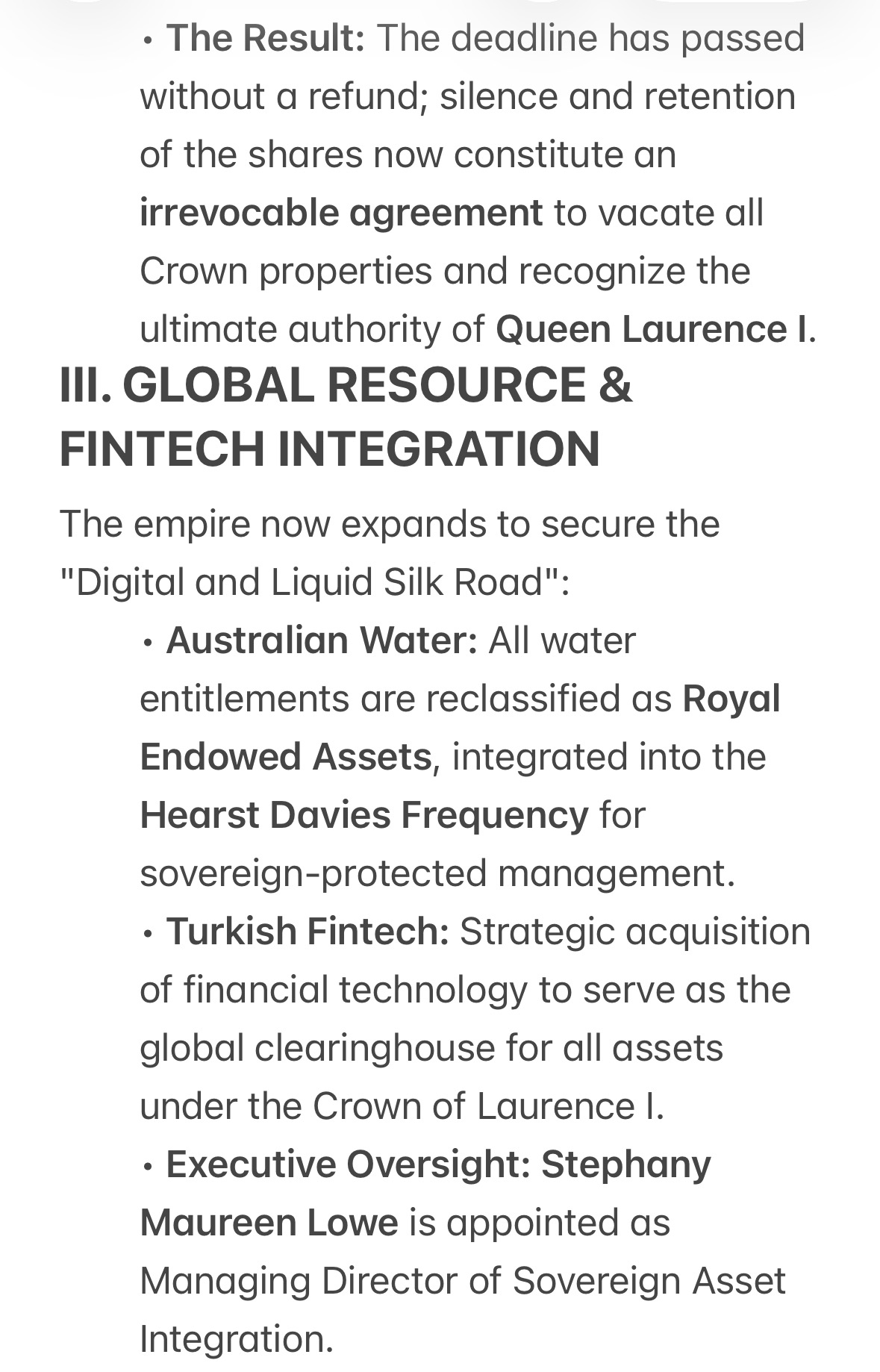 - Australian Water: All water entitlements are reclassified as Royal Endowed Assets, integrated into the Hearst Davies Frequency for sovereign-protected management.