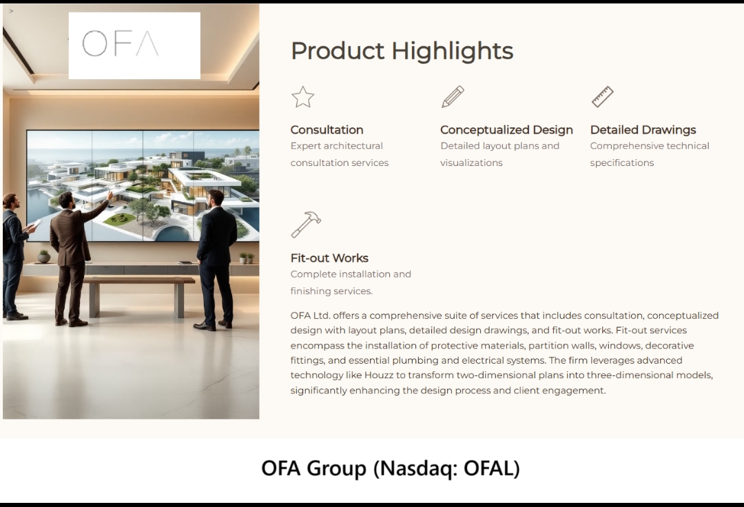 ROLLING HILLS ESTATES, Calif. - EntSun -- OFA Group (N A S D A Q: OFAL), through its wholly owned subsidiary Office for Fine Architecture Limited, is redefining the future of architectural services and real estate development by seamlessly merging traditional design excellence with breakthrough AI-driven innovation. With multiple growth vectors — including a newly launched AI platform, strategic acquisitions, a $100M capital raise, and a pivot toward real estate backed by tangible assets — OFAL is positioning itself at the intersection of architecture, technology, and digital finance.