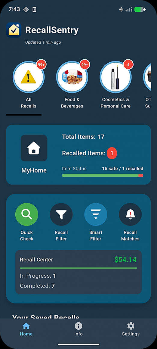 The Center for Recall Safety (CFORRS) today announced the public launch of RecallSentry™, a free mobile app that monitors official recall databases from four federal agencies — the FDA, CPSC, NHTSA, and USDA — and sends personalized alerts when a recalled product matches something in a user's home.