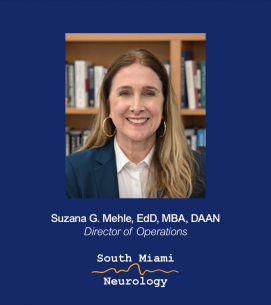 Suzana G. Mehle, EdD, MBA, DAAN, serves as the Director of Operations for South Miami Neurology in South Miami, Florida. South Miami Neurology (SMN) is an affiliate of First Choice Neurology, the largest private practice, physician-owned neurology group in the United States. SMN includes a team of seven neurologists, nurse practitioners, neurodiagnostic technicians, and support staff dedicated to providing comprehensive neurological care to patients throughout South Florida.