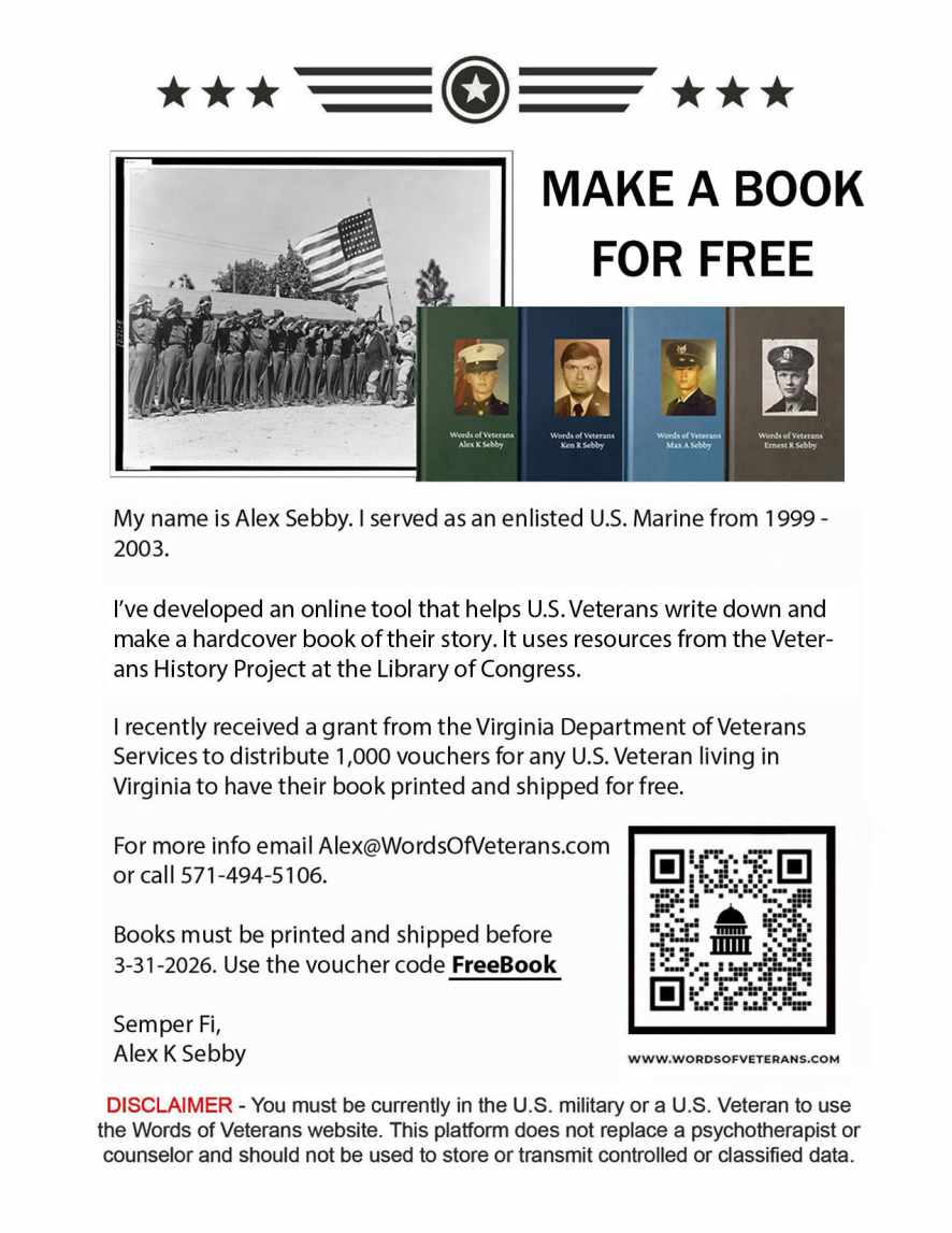 In the spirit of Christmas 2025, Sebby is announcing a special initiative made possible through a grant from the Virginia Department of Veterans Services. The grant funds 1,000 vouchers for any U.S. Veteran currently living in Virginia to have their book printed and shipped completely free of charge.
