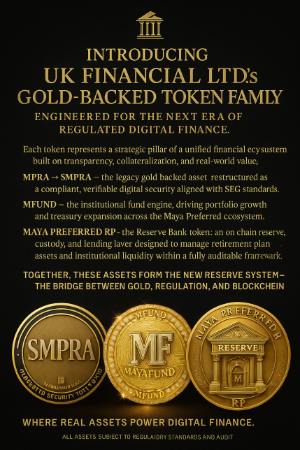 Founded in 2018, UK Financial Ltd is the creator of Maya Preferred PRA (MPRA), the world's first gold-backed cryptocurrency. The company manages one of the most transparent real-world-asset ecosystems in digital finance, with reserves mapped to multiple tokens, corporate wallets visible 24/7, and an eight-year operational record with no executive token sales or salaries.